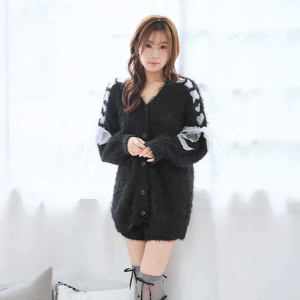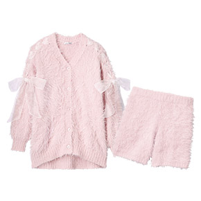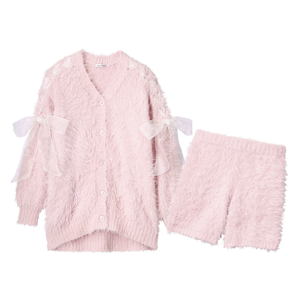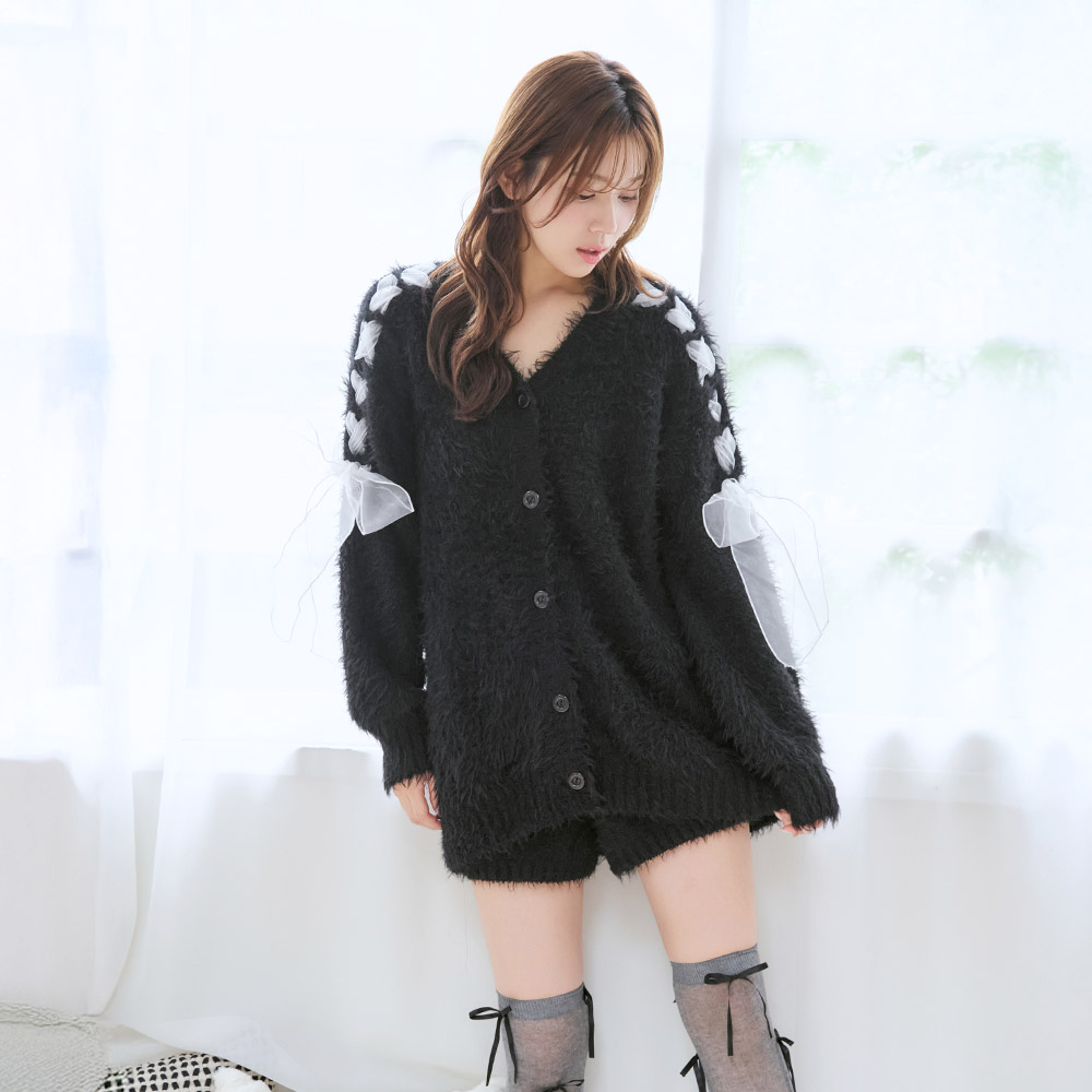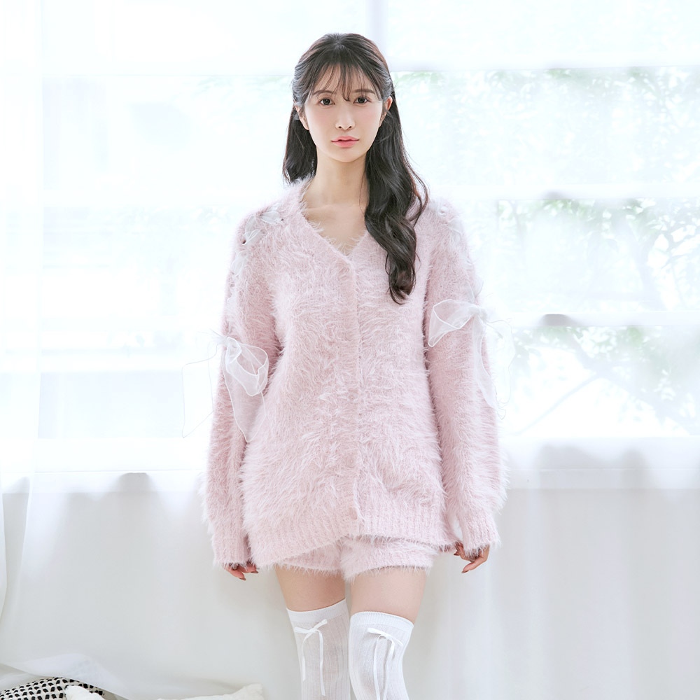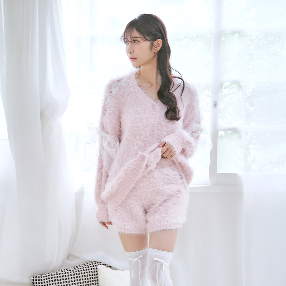 리본 디테일이 있는 섀기 니트 가디건과 숏팬츠로 집에서도 귀여우면서 사랑스러운 스타일을 완성합니다.