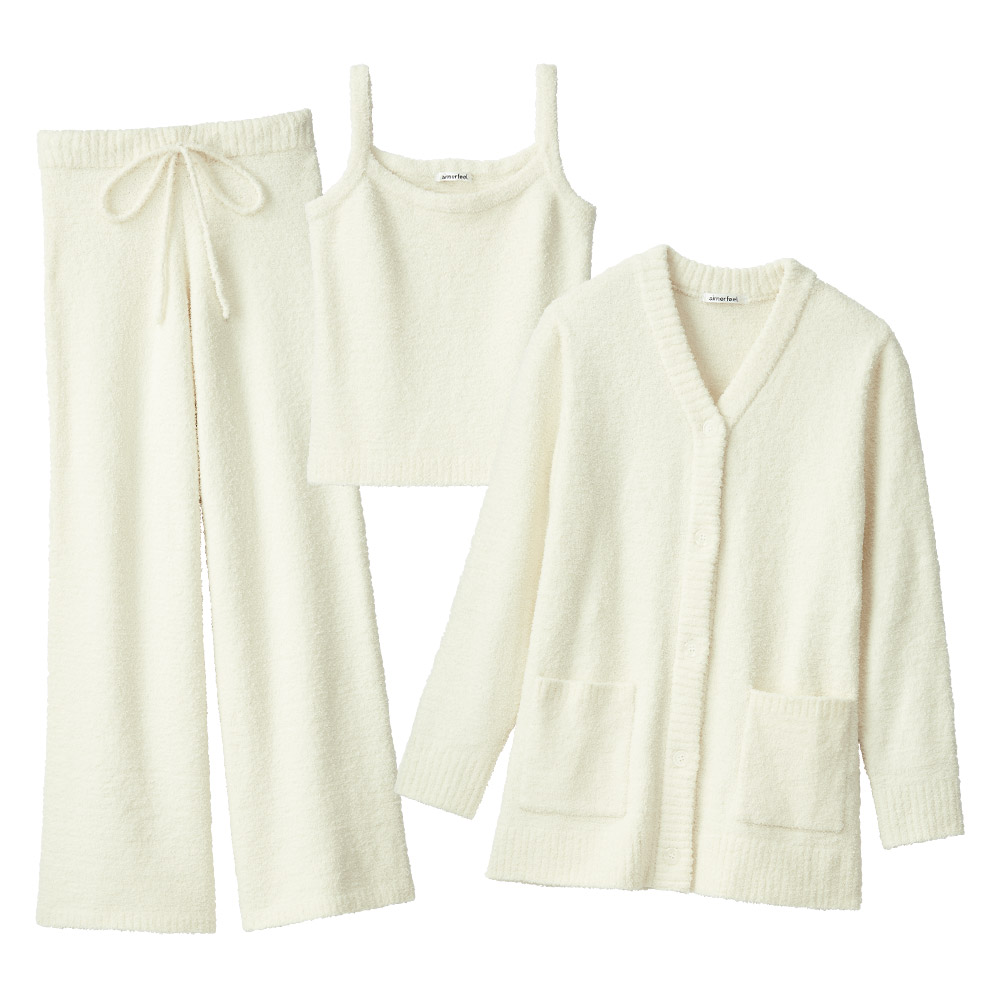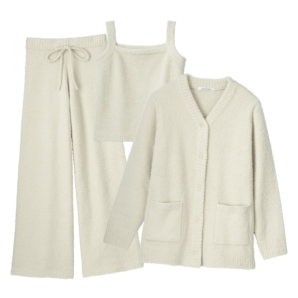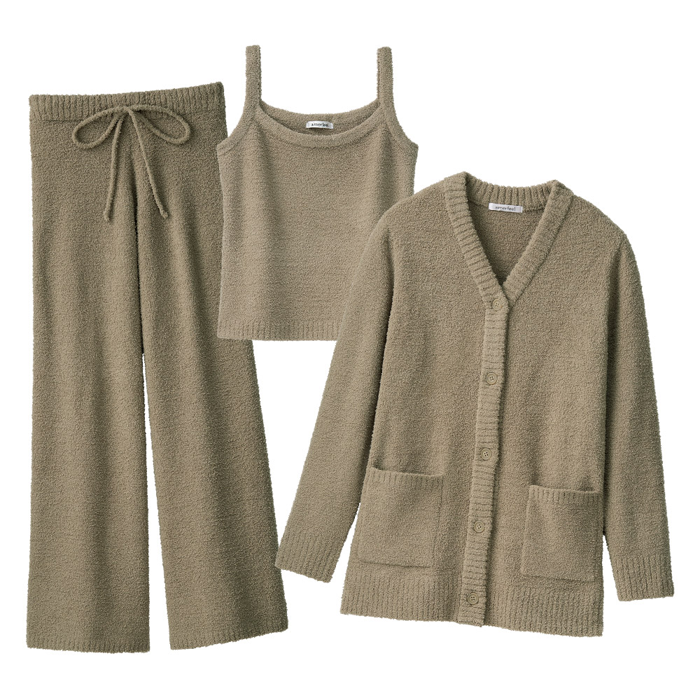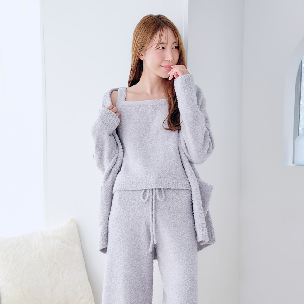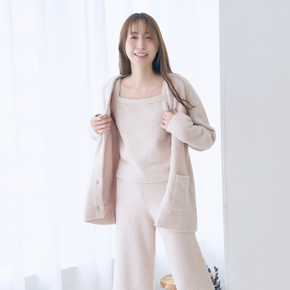 부드럽고 포근한 니트 소재 3종 룸웨어 세트로 가디건, 민소매, 와이드 팬츠로 구성되어 집에서도 세련되고 감각적인 무드를 연출할 수 있습니다.