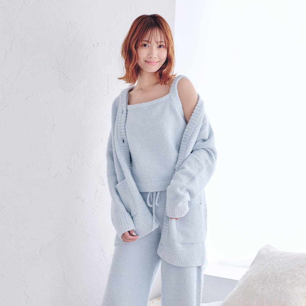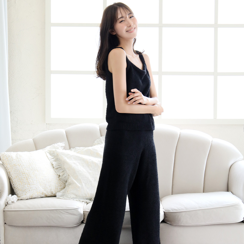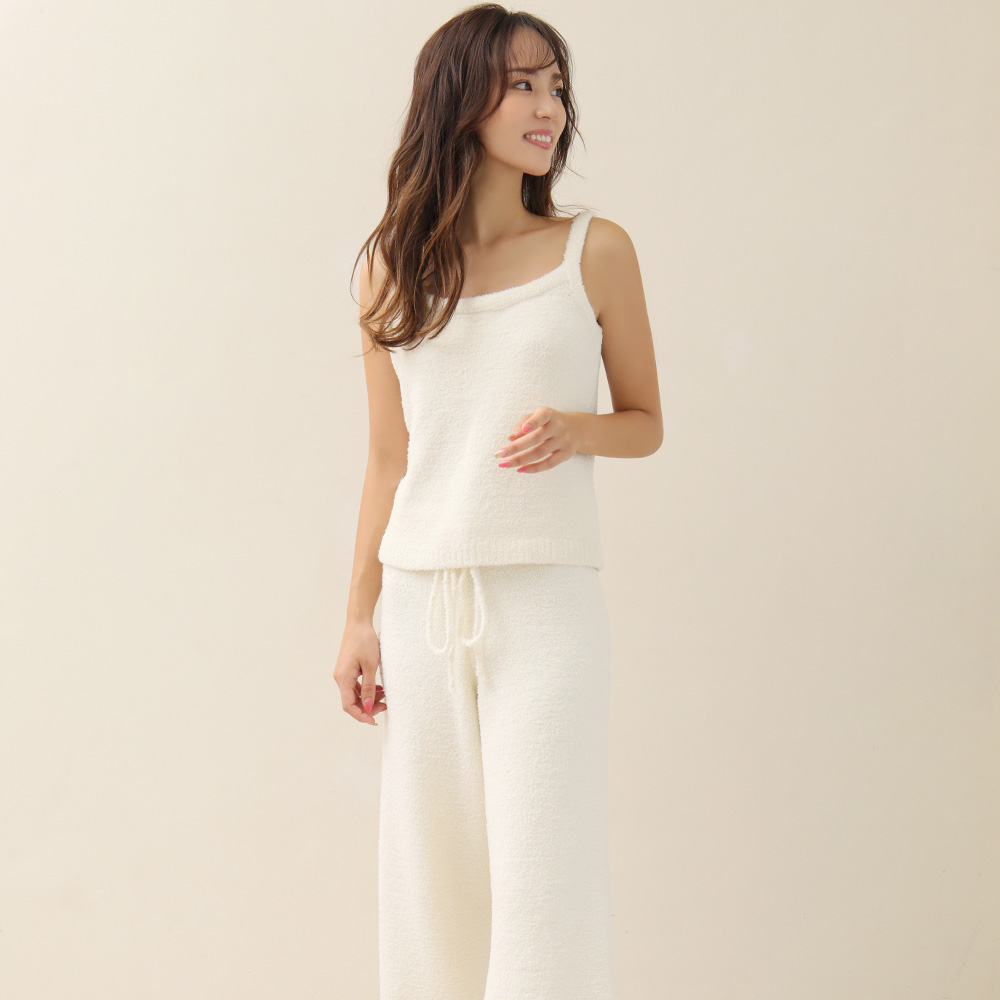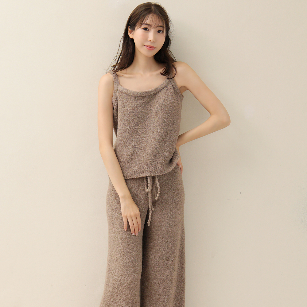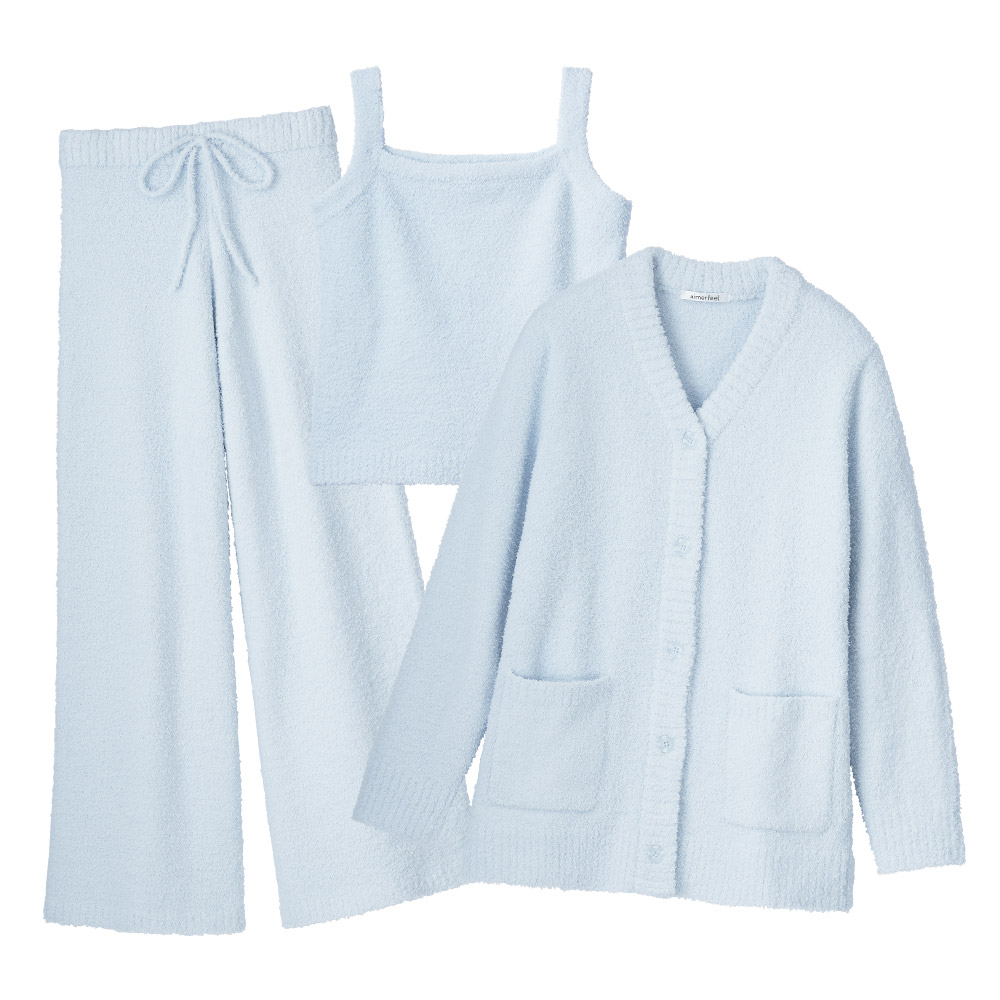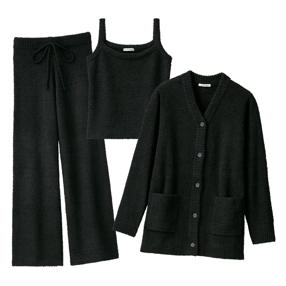 부드럽고 포근한 니트 소재 3종 룸웨어 세트로 가디건, 민소매, 와이드 팬츠로 구성되어 집에서도 세련되고 감각적인 무드를 연출할 수 있습니다.