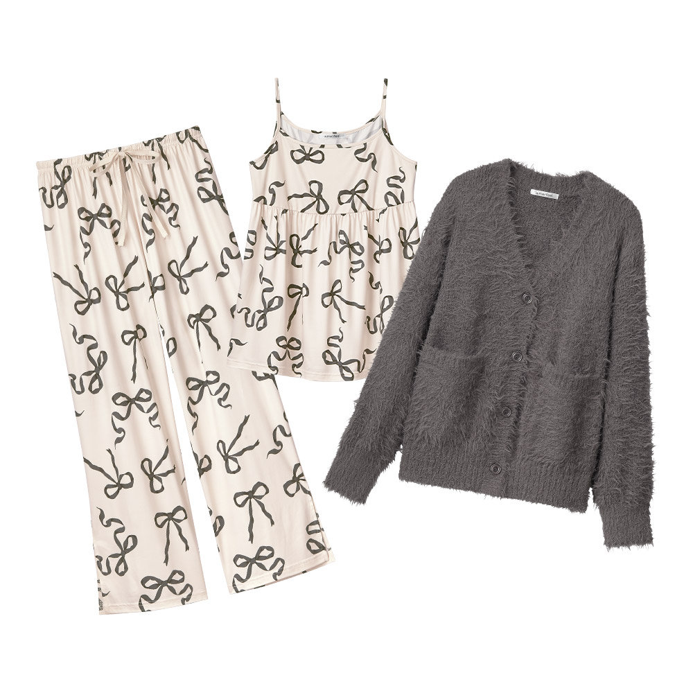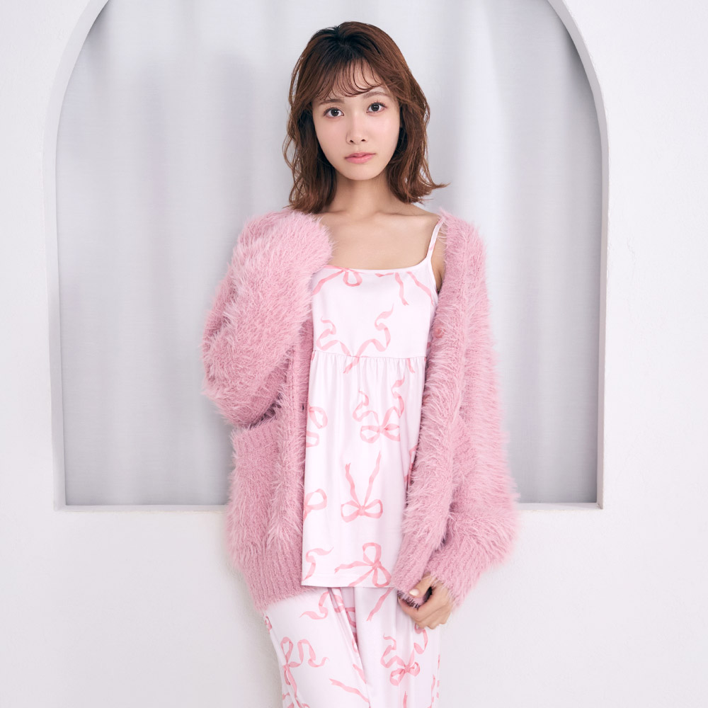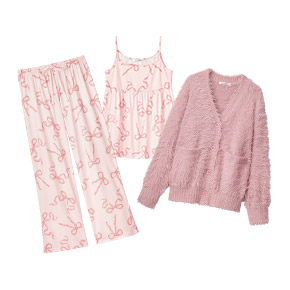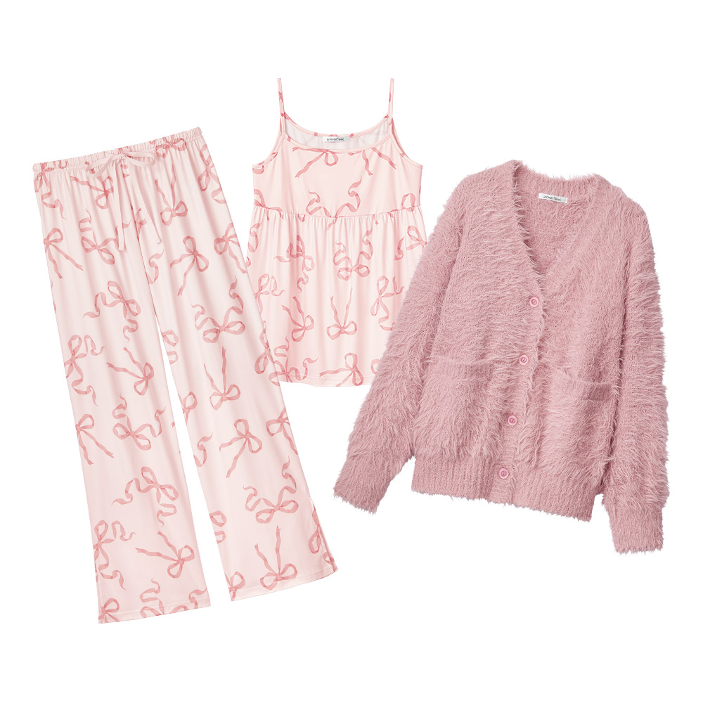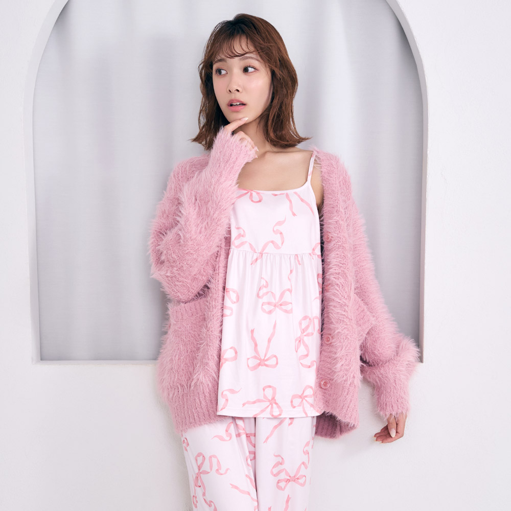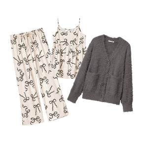 리본 패턴의 캐미솔과 팬츠, 부드러운 섀기 니트 가디건이 어우러져 세련된 홈 스타일을 완성합니다.